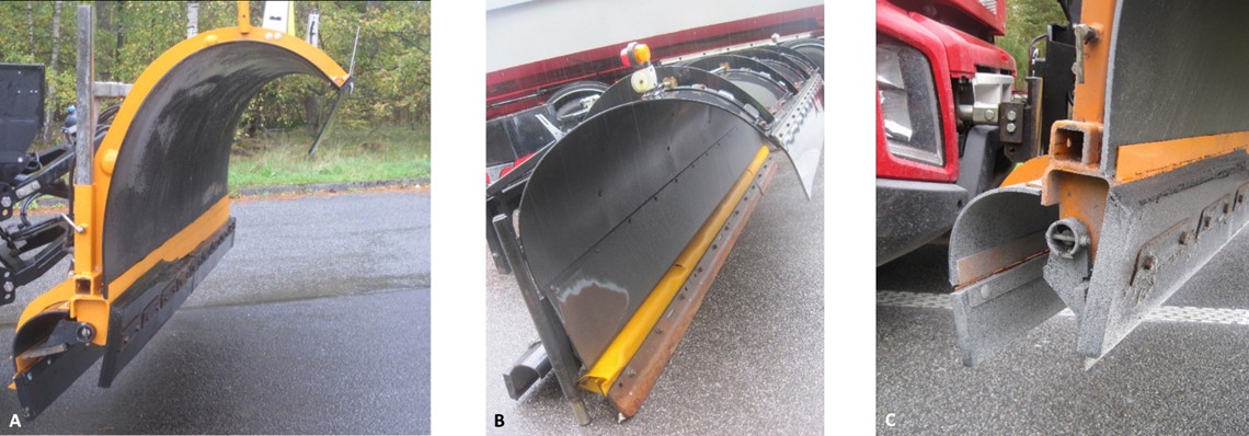 Drei verschiedene Schneepflüge (von links): A – Gummischild; B – Stahl-/Keramikschild; C – harter Metallschild.