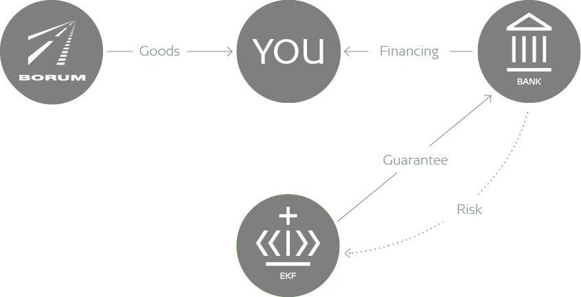 EKF provides a bank with a guarantee for a credit facility and assumes the greater share of the risk. You then secure financing from the bank and can go ahead and purchase Borum machines from Denmark under an advantageous financial arrangement.