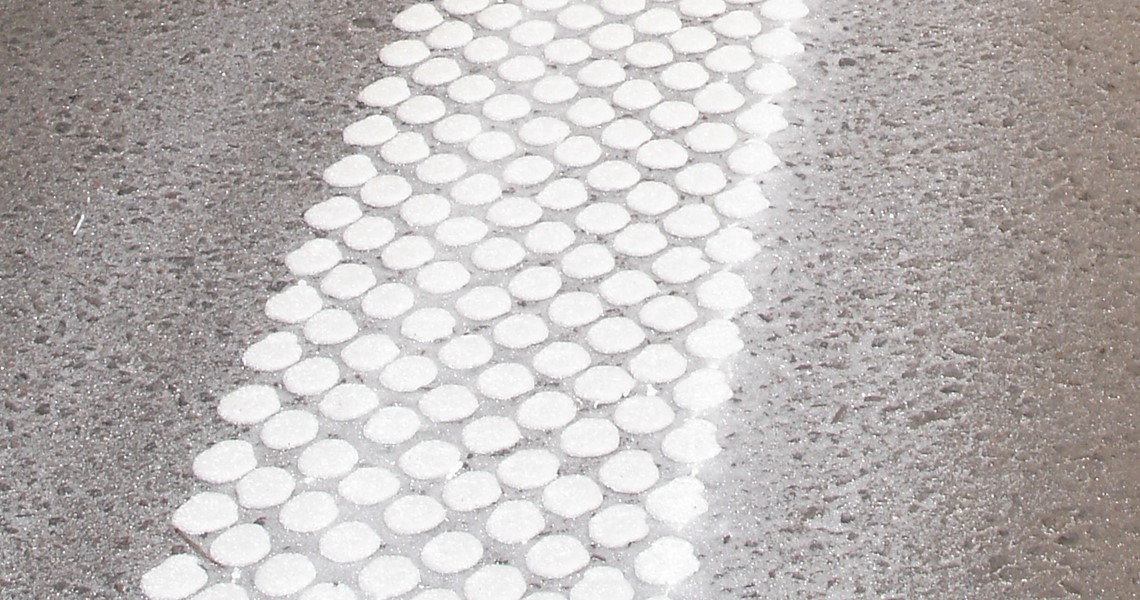 The day reflection of the combined line is somewhat better than the Agglomerate alone. When looking at the retro-reflection at night the Agglomerate marking alone is better than the combined line. The reason is the larger perpendicular surfaces on the Agglomerate marking – the dots are higher and reflect the light back towards the driver (retro–reflection).