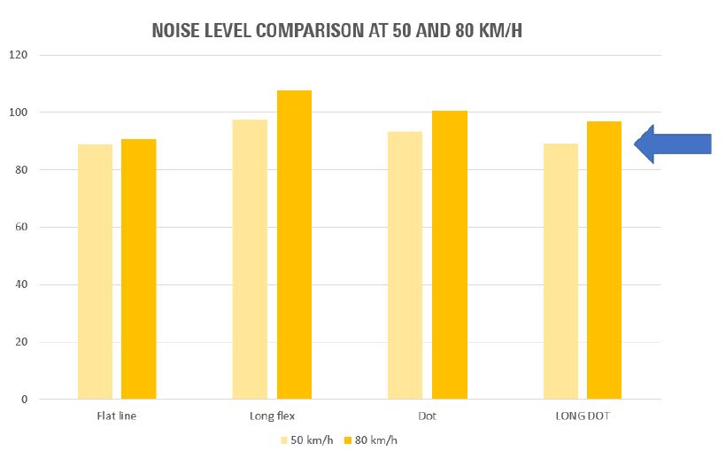 The marking produces almost the same noise level as an ordinary flat line while having these much-needed visibility features for safely guiding traffic.