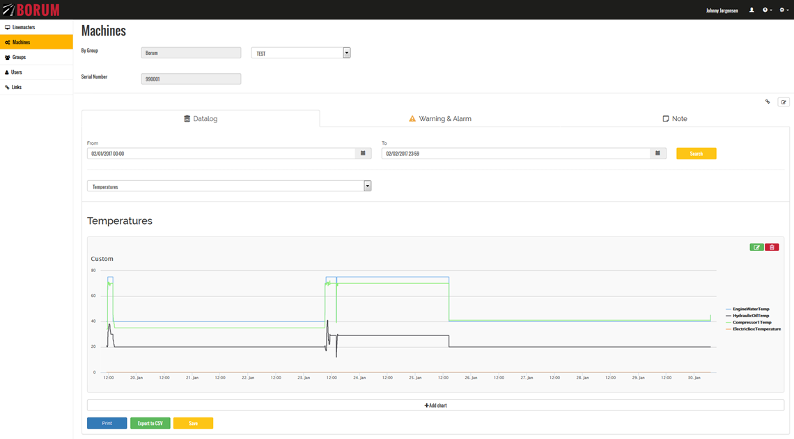 In the data log there there are 2 preset charts: One concerning temperature and one concerning Warnings and alarms.