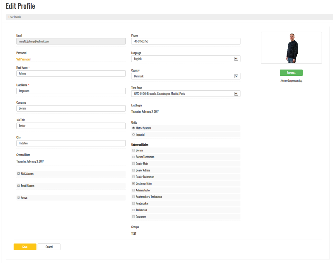 Your profile already contains the data that you entered in the Confirmation section. You can now edit these data. Your Universal Roles is set by Borum to “Customer Main” and it cannot be changed unless agreed otherwise with Borum.