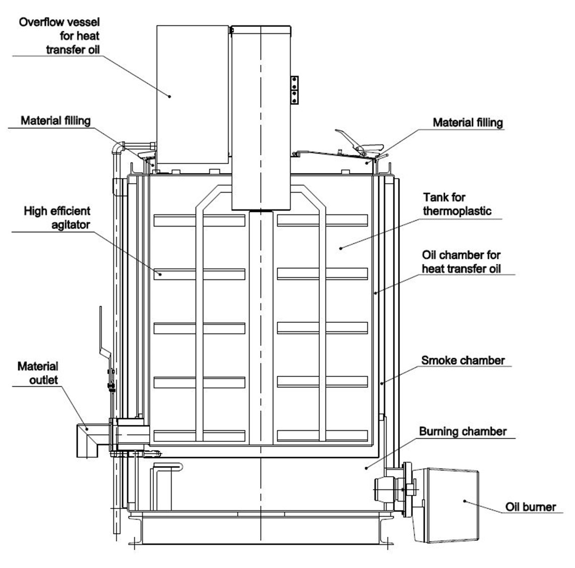 The thermoplastic material is heated via thermal transfer oil in a separate chamber heated by the burner. The oil chamber is found in the preheater's side walls. Therefore, the heating of the thermoplastic material is done from various angles due to the oil chambers surrounding the preheater. This is different compared to the direct heating system where the heating is done from one location - the bottom of the preheater.