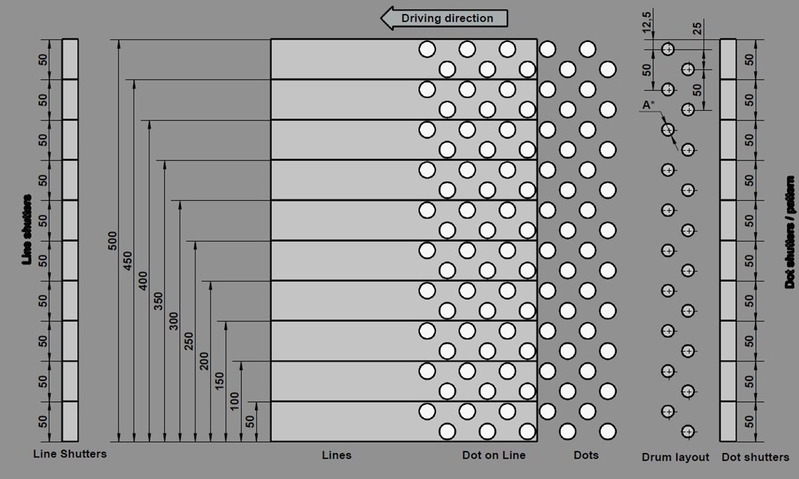 The equipment is supplied with two sets of shutters - one set for applying flat lines and profiled markings and one set of shutters for applying dots. This set-up makes it possible for the equipment to apply various line types and patterns as well as a combination of dots over line. By using two sets of shutters the base line has time to cure slightly before the dots are applied and consequently, the dots will settle on top of the line with sharp edges, securing the optimum retroreflection.